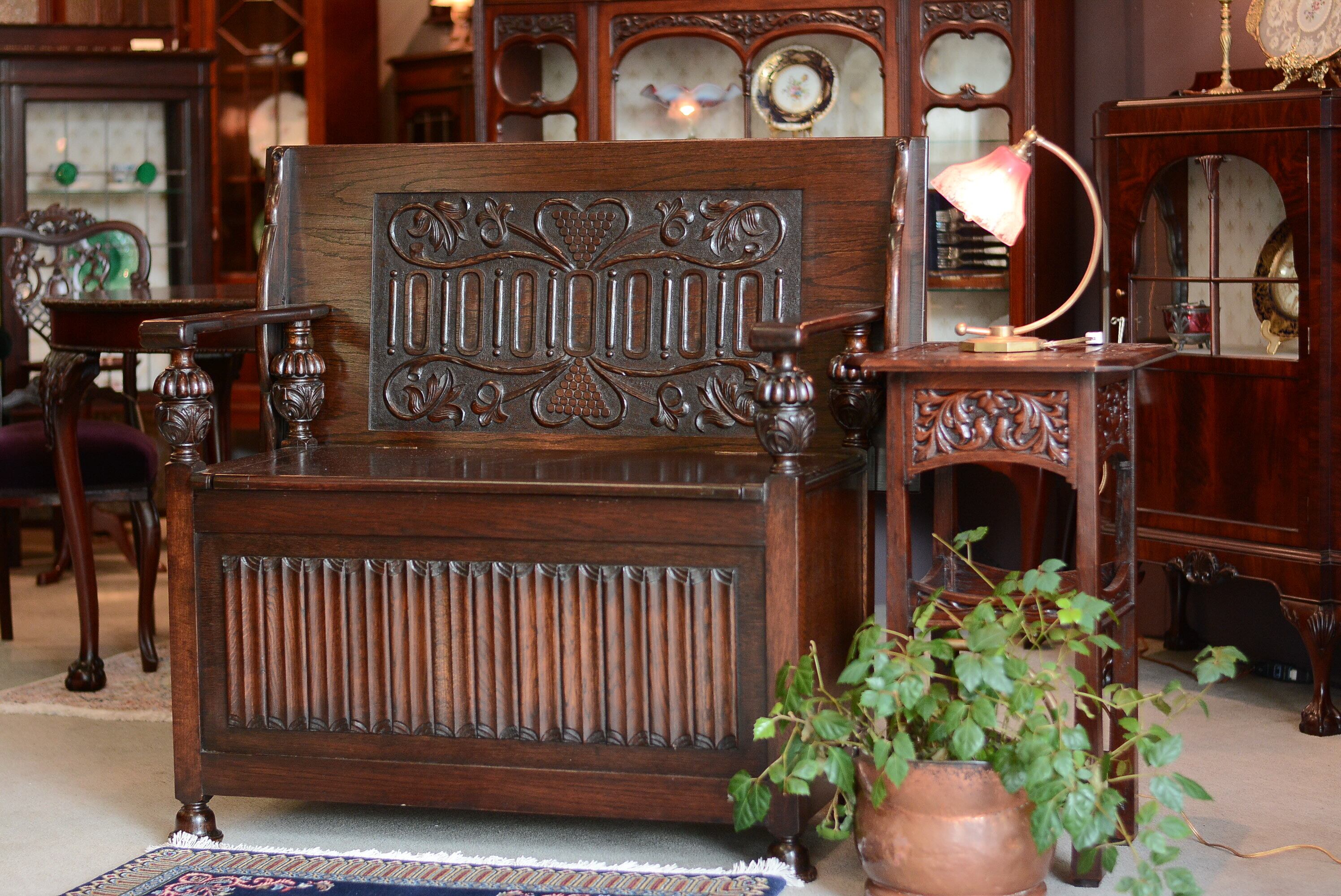 223a563《モンクスベンチ》アンティークベンチ 彫刻がしっかりと入った収納できるベンチ