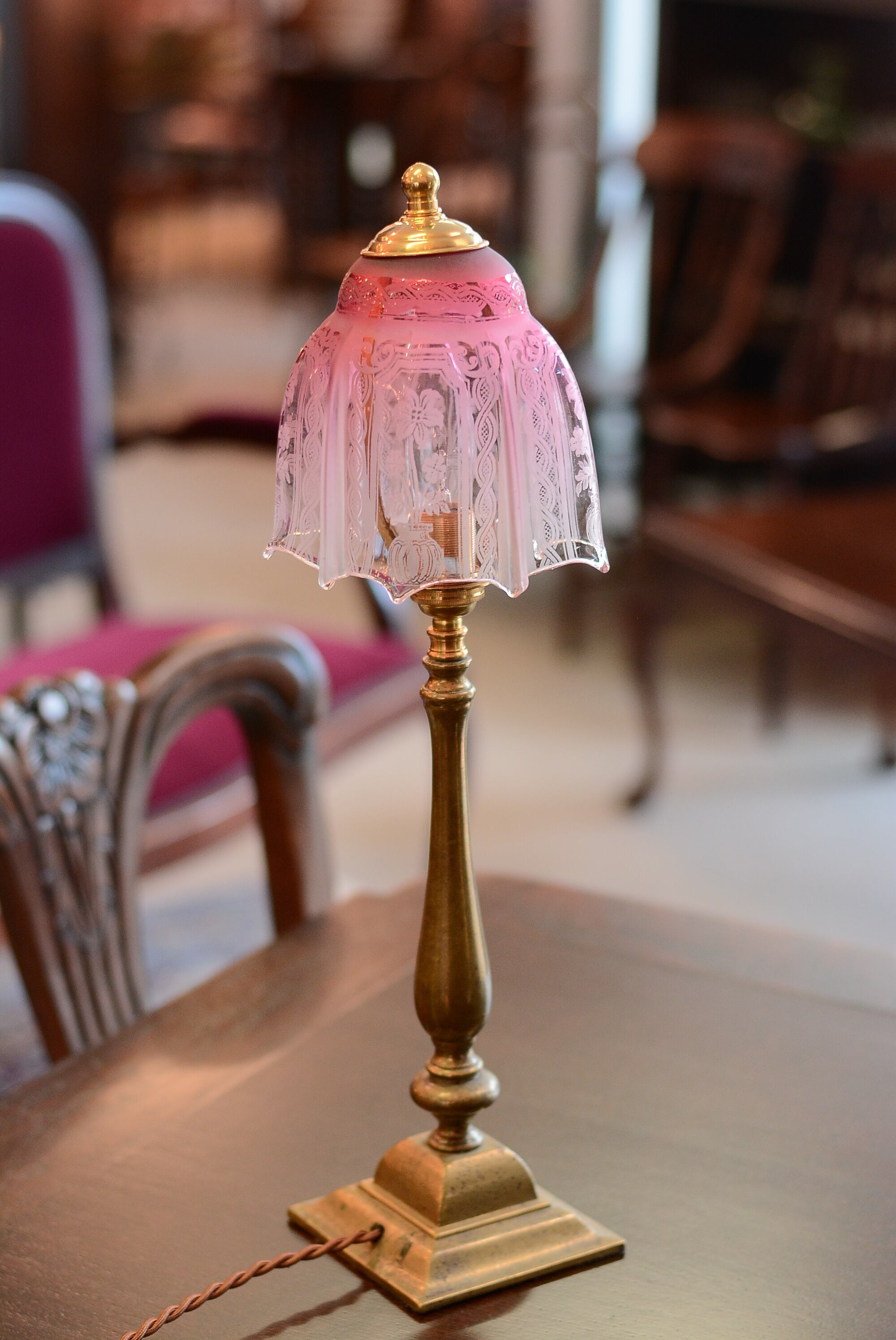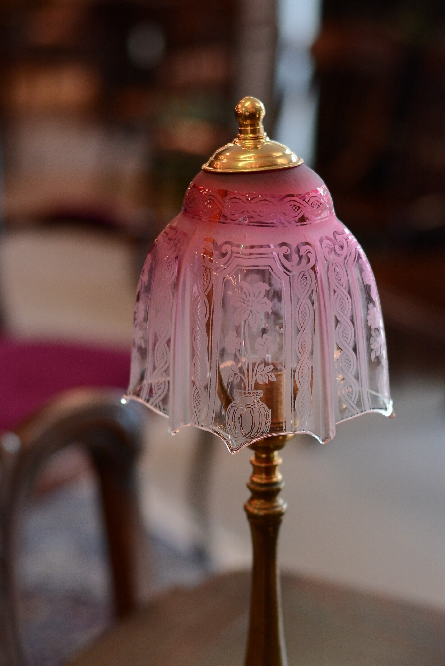 g-044《テーブルランプ》アンティークテーブルランプ エッチングガラスシェード 美しいクランベリーガラス