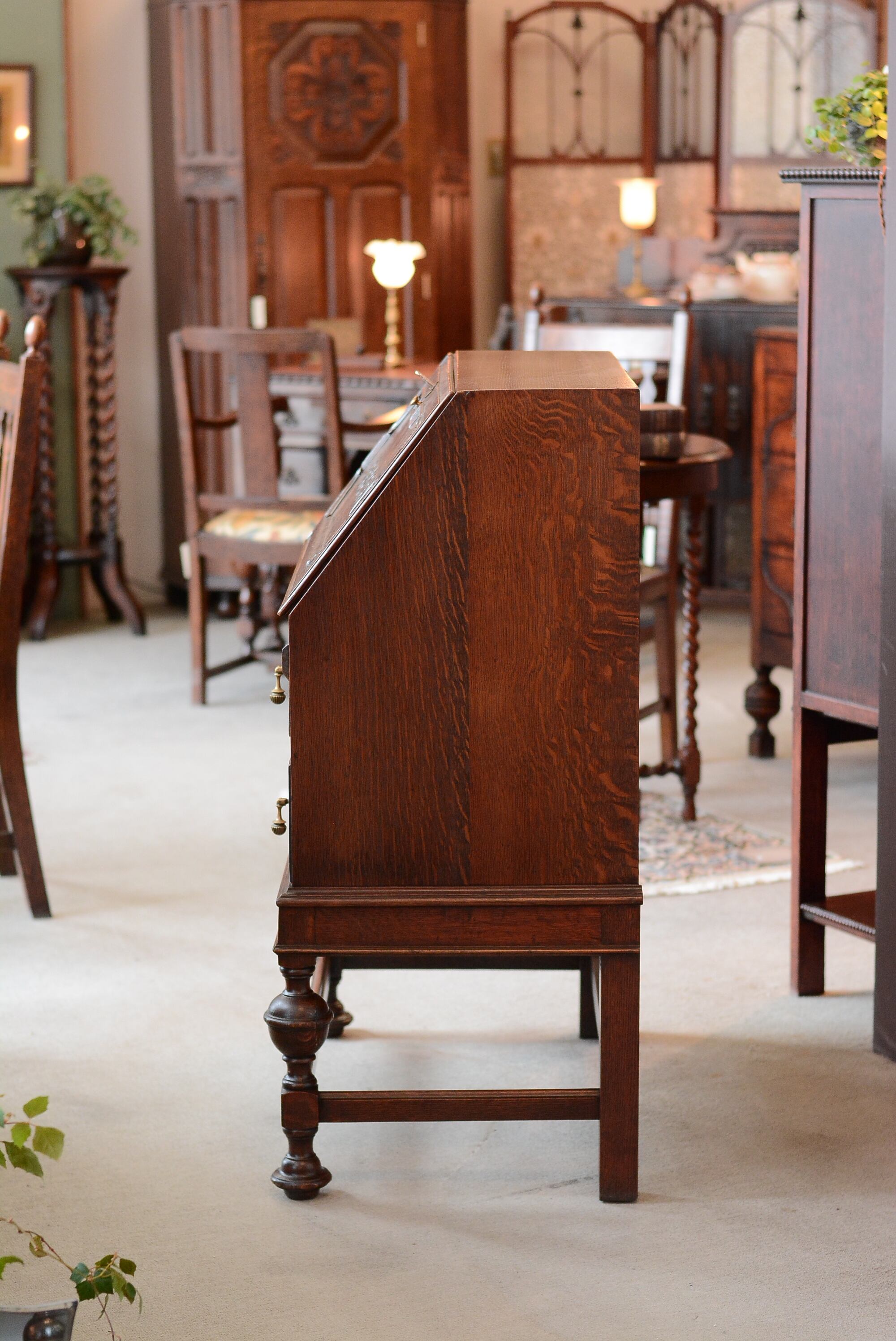 穏やかなオークの木目が美しく落ち着いた印象のアンティークライティングビューロー。