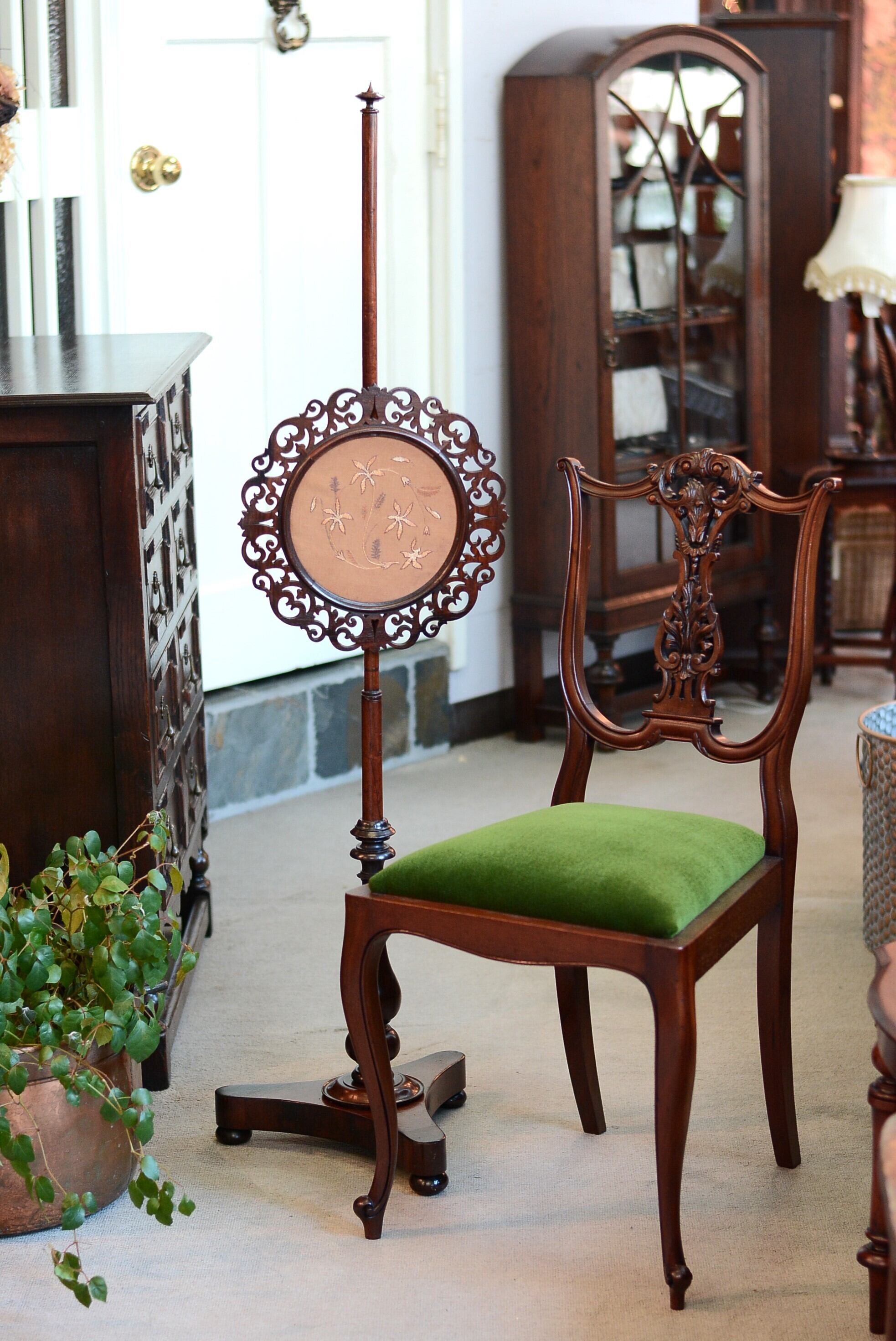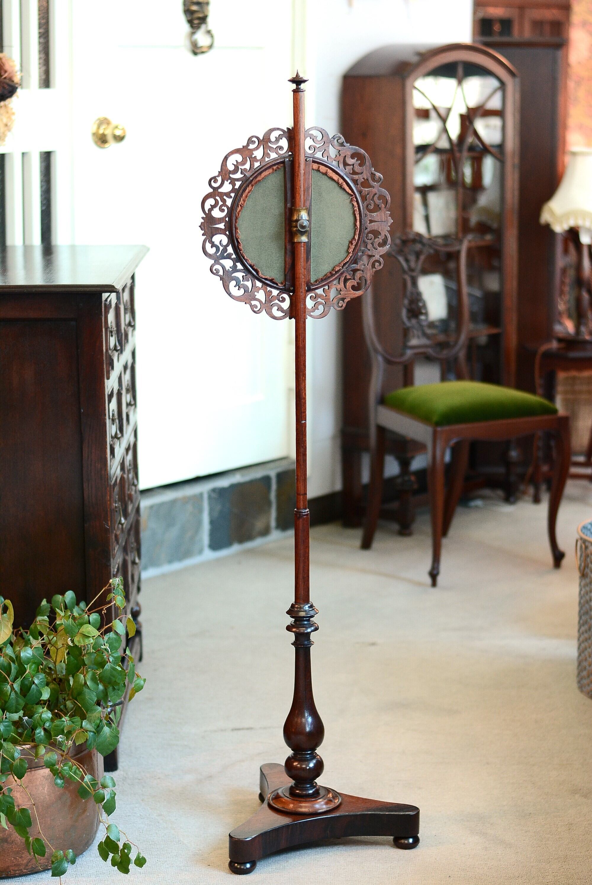 243a798《ファイヤースクリーン》イギリスアンティーク エレガントなフェイススクリーン 刺繍 美しい透かし彫り 高さが変えられる