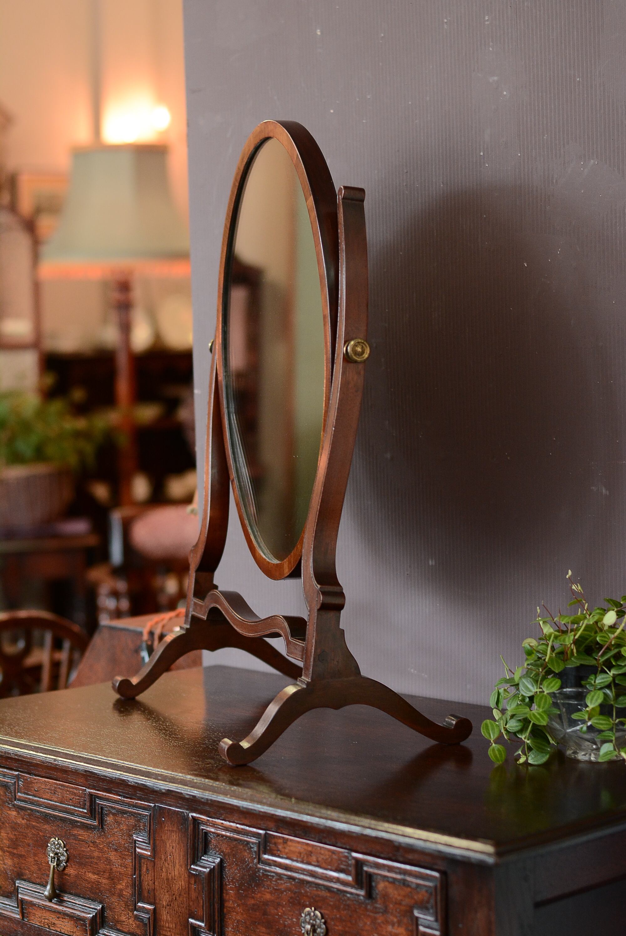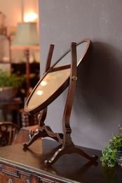 優しい曲線が美しいオーバル形のアンティークスタンドミラーです。