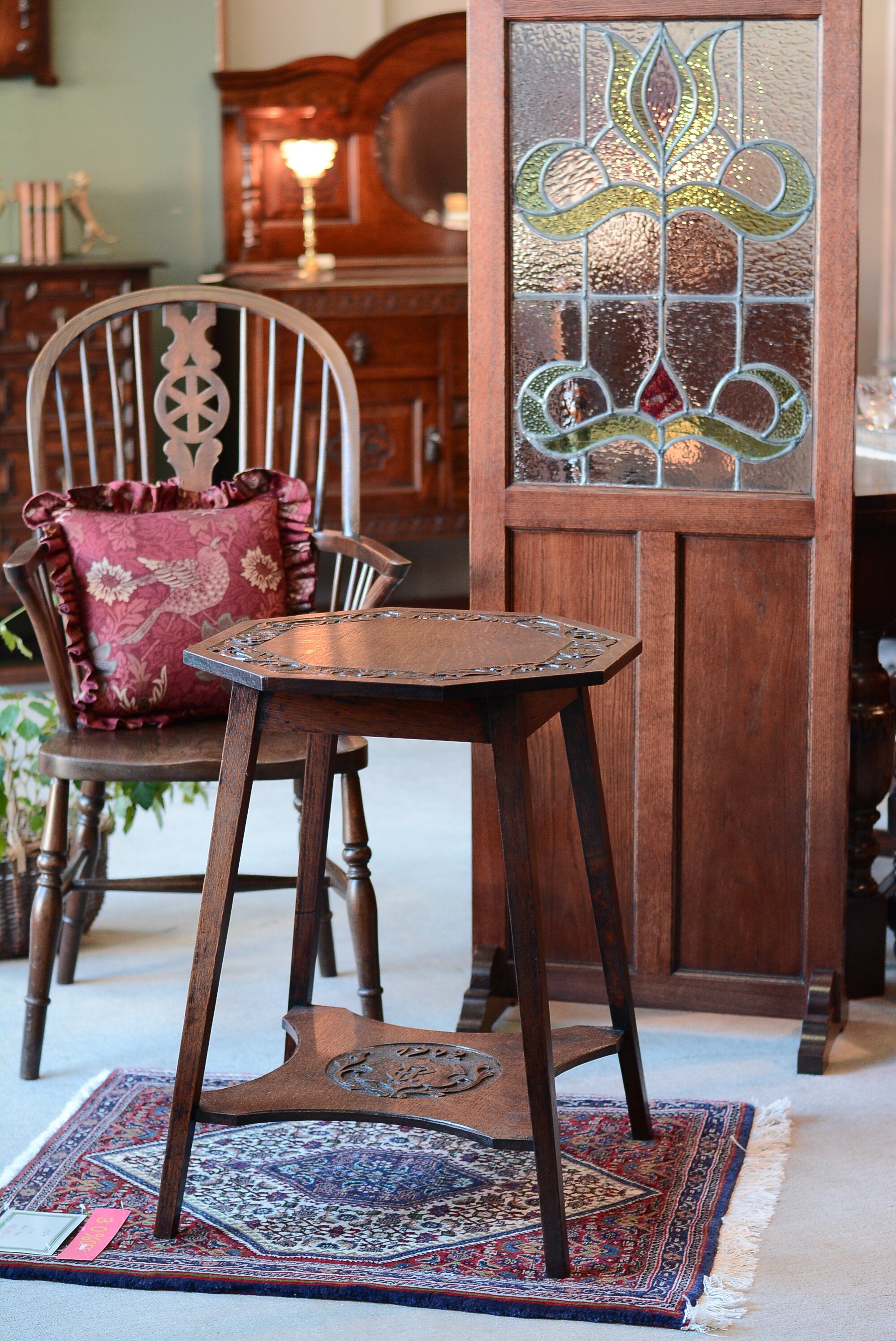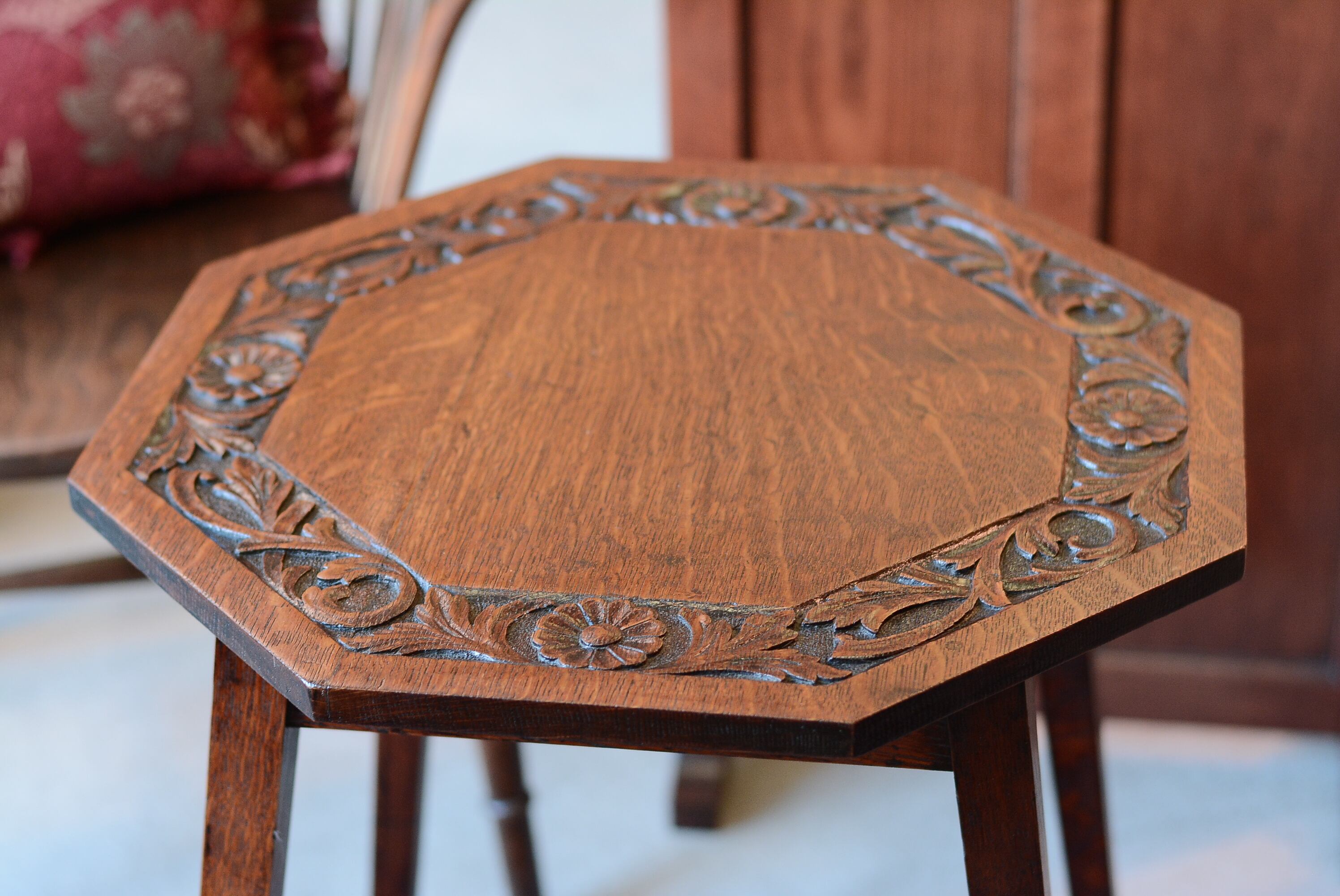 重厚感のある彫刻が印象的な8角形のアンティークホールテーブル。