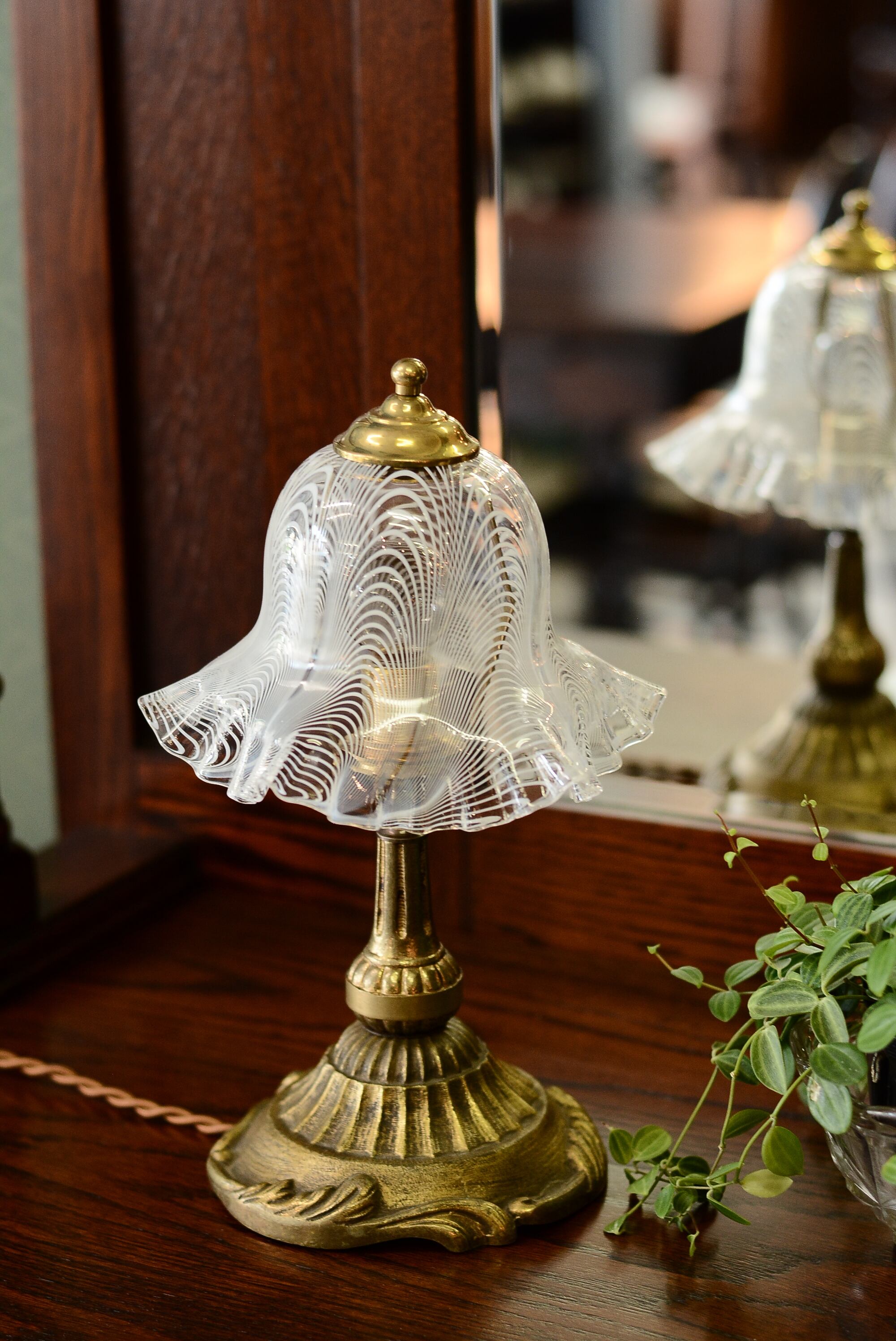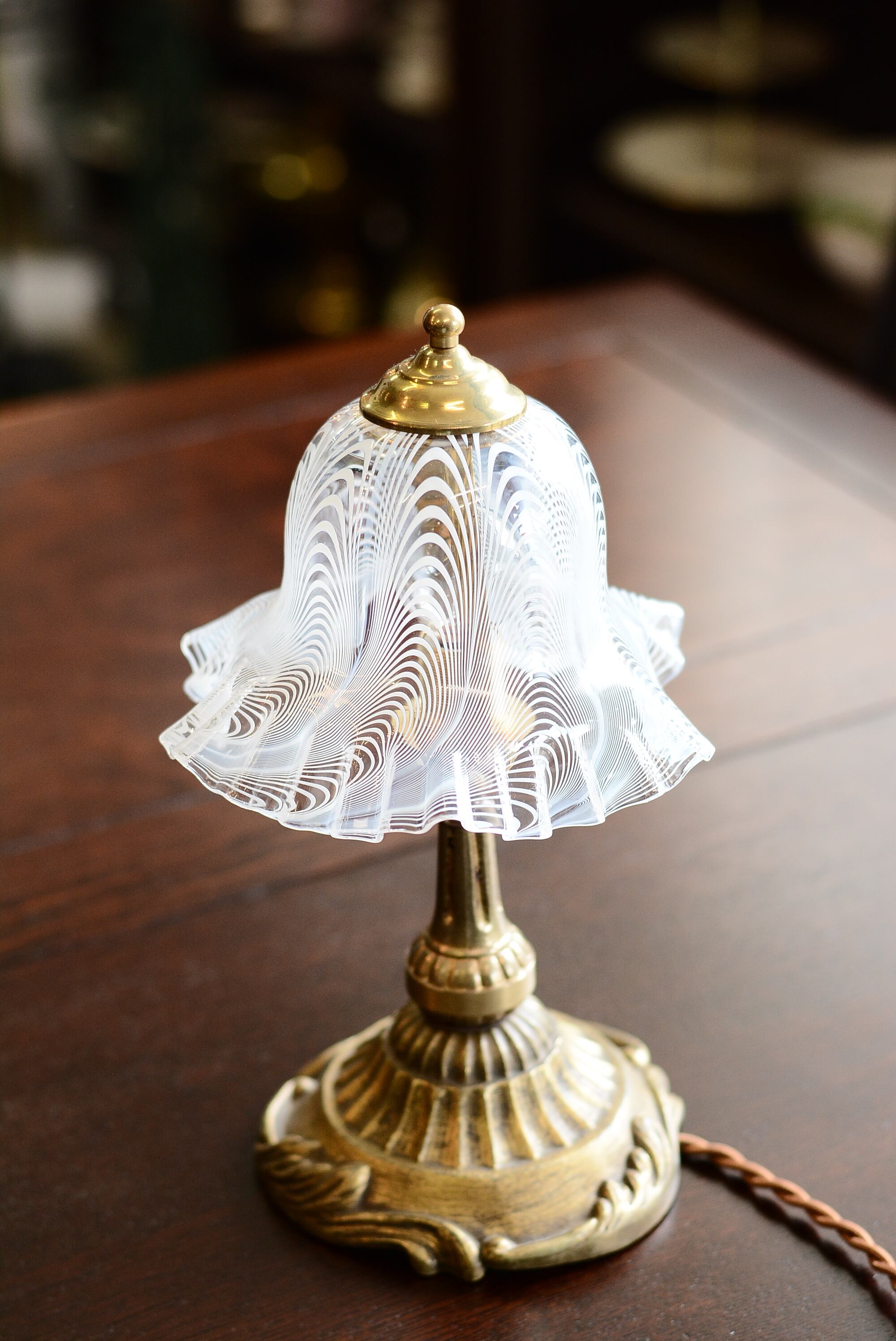 レースのように優美なアンティークガラスシェードのテ―ブルランプ。