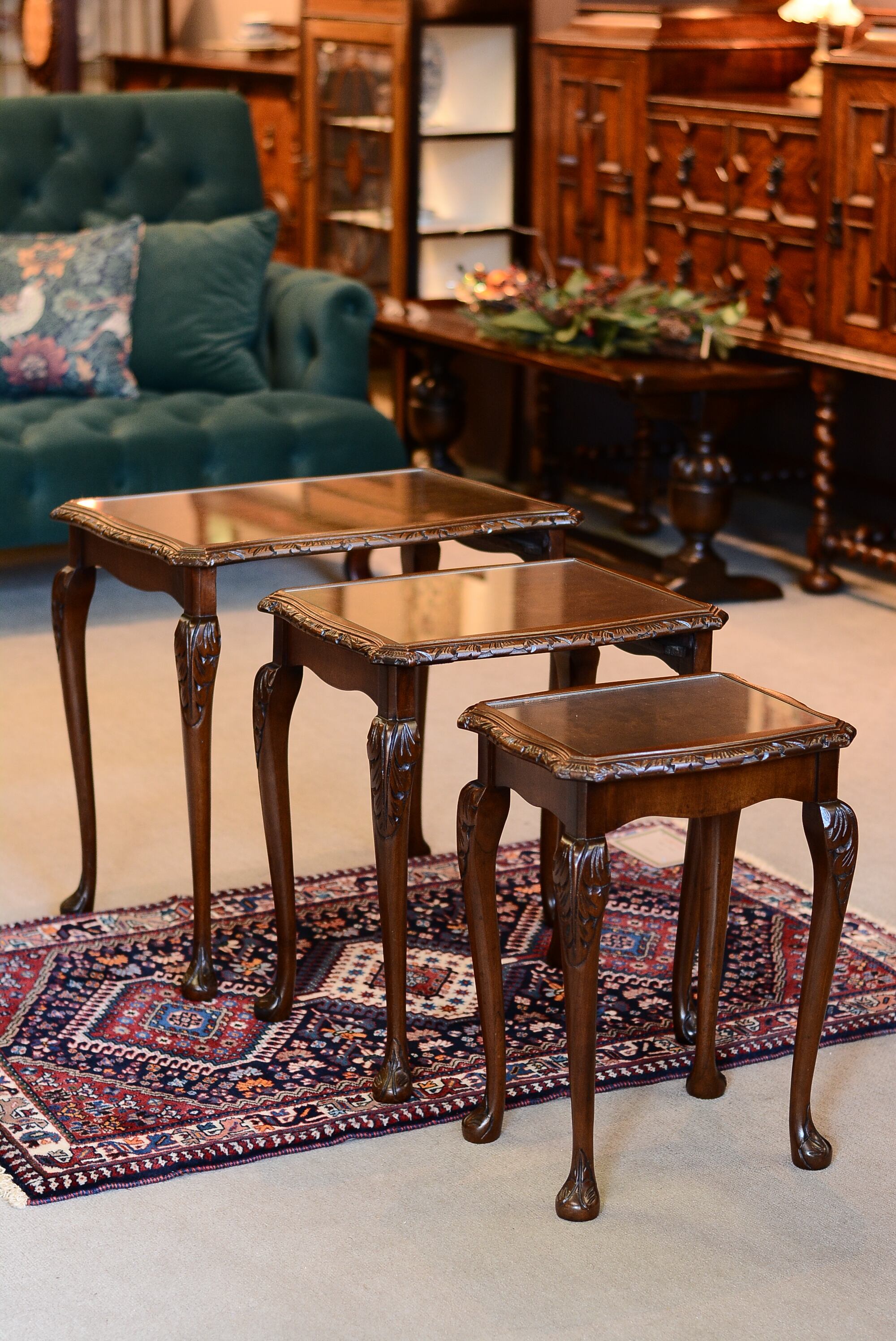 足の先まで美しい彫刻が施されたアンティークネストテーブル。